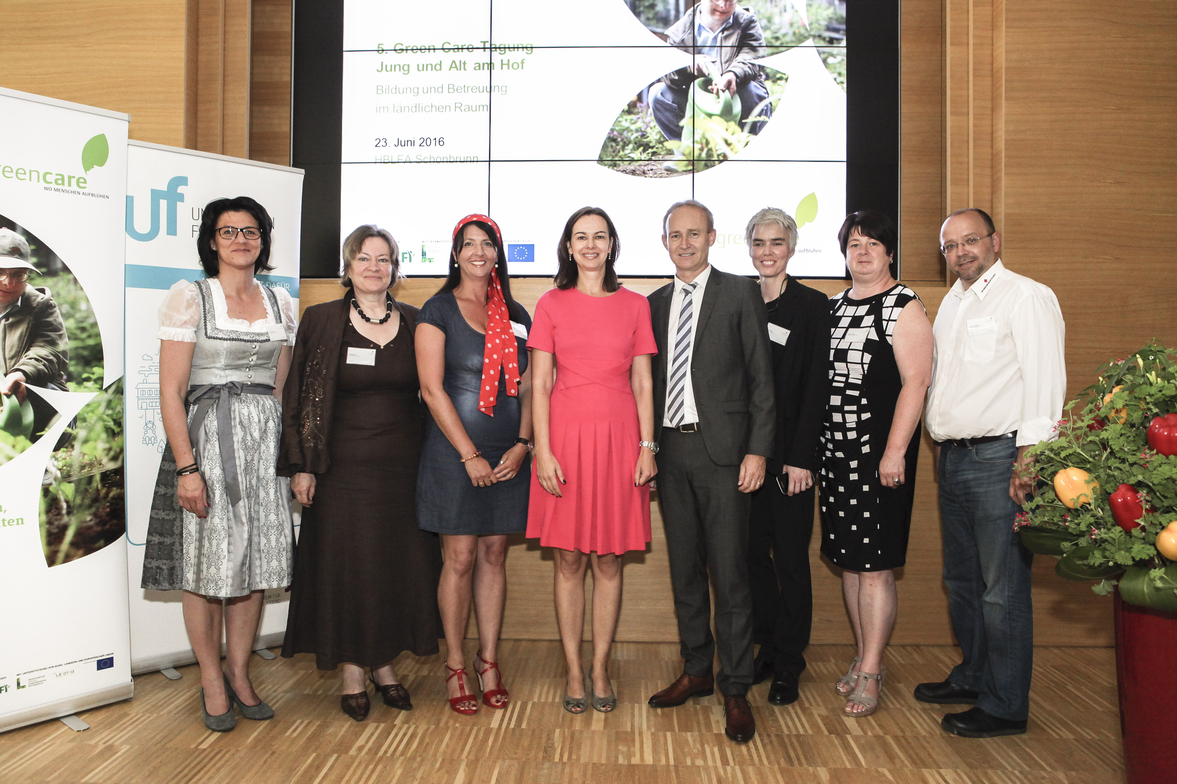 Welche wichtige Rolle aktive Land- und Forstwirtschaftsbetriebe bei der Betreuung von Kindern und älteren Menschen spielen können, stand im Mittelpunkt der 5. Green Care-Tagung, die am 23. Juni in der Höheren Bundeslehr- und Forschungsanstalt für Gartenbau (HBLFA) Schönbrunn in Wien stattfand. Einerseits beleuchteten Familienministerin Sophie Karmasin und Green Care Österreich-Obmann Robert Fitzthum aktuelle gesellschaftliche Herausforderungen und politische Antworten. Andererseits präsentierten einige Pionierbetriebe und eine Leader-Region ihren Weg, sich mit Hilfe von Green Care ein zusätzliches wirtschaftliches Standbein zu schaffen. Auch heuer war die Veranstaltung wieder bestens besucht und lockte über 200 Green Care-Interessierte und Entscheidungsträger aus verschiedensten Sparten wie Landwirtschaft, Soziales, Gesundheit, Bildung und Familienpolitik an.